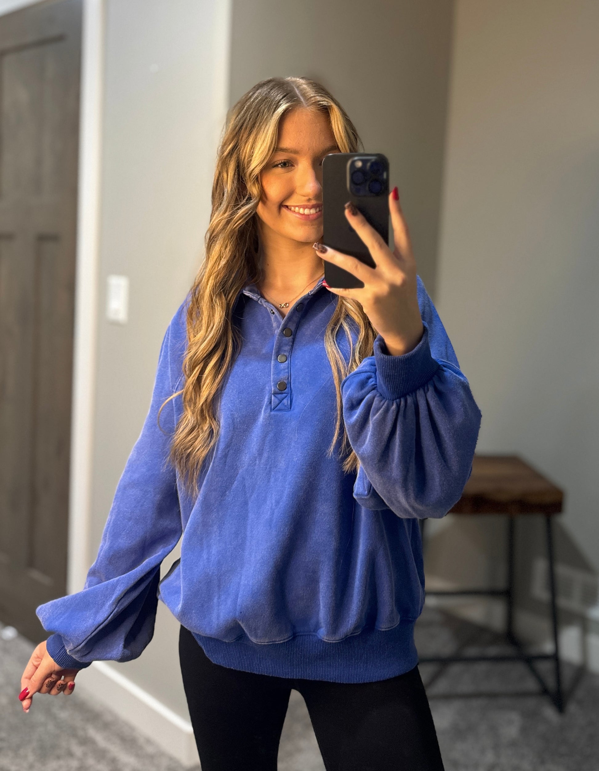 This royal blue Harlow Pullover is a must-have for your wardrobe. With its quarter button up design and balloon sleeves, it adds a touch of elegance to any outfit. Made with mineral washed fabric, it boasts a soft and high quality feel. Elevate your style with this versatile piece.